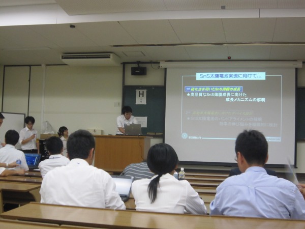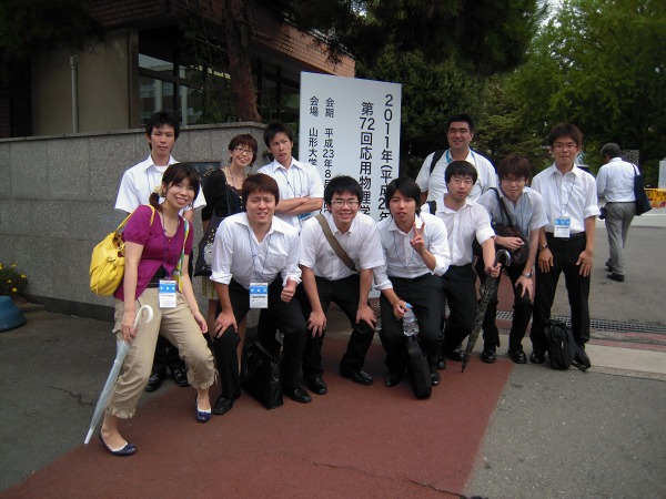| 2011-8-29〜9-2 秋の応用物理学会発表 山形大学で開催された、秋の応用物理学会で、10件の発表を行いました。 ![]() 計11名の大所帯…。 ![]() 4年生の加山君はホテルでも発表練習…。 ![]() 発表前の昼休みに。200名を越える多くの参加者でした。 ディスカッションしていただいた皆様に感謝申し上げます。 ![]() 学会は夜も大切なコミニュケーションの時間。兵庫県立大・大阪大の皆さんと。 ![]() 世界初(?)の太陽電池コントで盛り上がりました。 ![]() いつもの東北大・理研などの皆さんとの交流会。 学会は勿論、山形の美味しい食べ物を満喫した5日間でした。 |