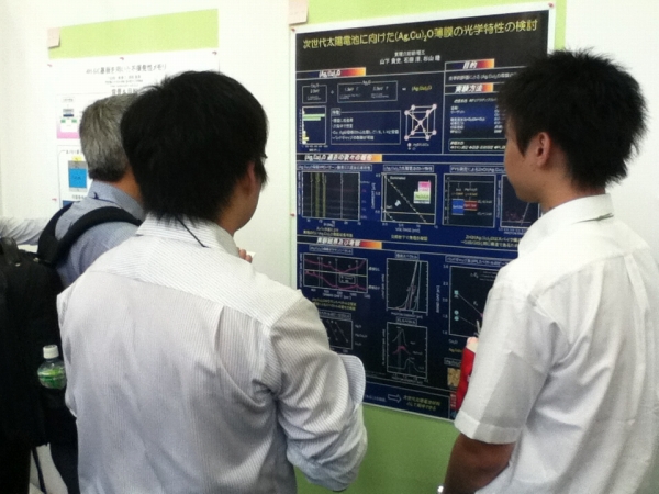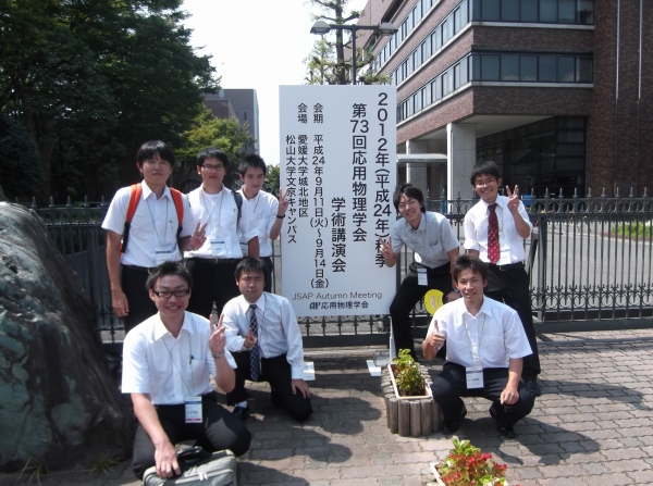 | 2012-9-11〜14 秋の応用物理学会 @ 愛媛大学 秋の応用物理学会が愛媛大学で開催され、 杉山研究室からは7件の発表を行いました。 ![]() 愛媛大学と松山大学のキャンパスで行われました。 4年生と張さんは初めての学会…。 ![]() 発表するのも勿論初めてなので、夜は毎晩練習です…。 ![]() ![]() 口頭発表は撮影禁止なので、ポスター発表会場にて。 御議論頂いた皆様ありがとうございました。 ![]() 美味しいものをたべたり…、 ![]() 遅い夏休みを満喫しました…。 |