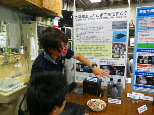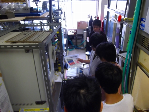 オープンキャンパス開催 野田キャンパスのオープンキャンパスが開催され、杉山研も 研究室見学会などを行いました。 ![]() 12号館1階で電気電子情報工学科の紹介をした後、 ![]() 太陽電池や半導体に興味がある方に、杉山研の研究内容を説明したり、 ![]() 実際の半導体作成・評価装置を見学して貰いました。 ![]() 実際の説明は4年生を中心に…。 杉山研はいつでも見学できます。興味のある方はお越しください…。 |