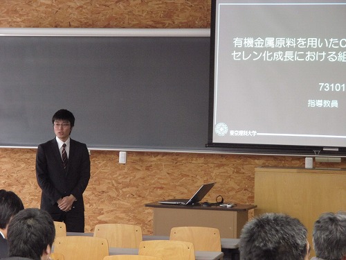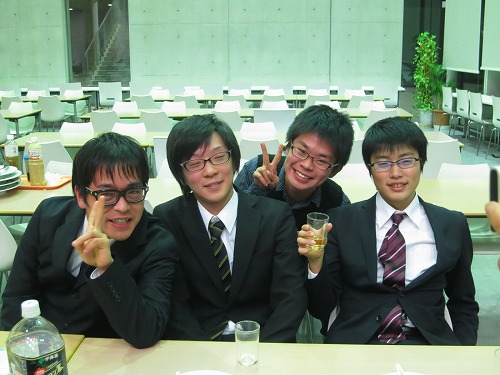 2013年度卒業研究発表会 4年生にとって1年間の総まとめ、卒研発表会が開催されました。 ![]() 発表前もリラックス…。 ![]() 山口君の発表。 ![]() 見学に来てくださった皆様ありがとうございました。 ![]() 発表が終わって…。 ![]() まだ修論発表が終わっていないので打ち上げは薬学部の学食で…。 ![]() 貸し切りパーティーです…。 ![]() ![]() 4年生の皆さんお疲れさまでした。 |