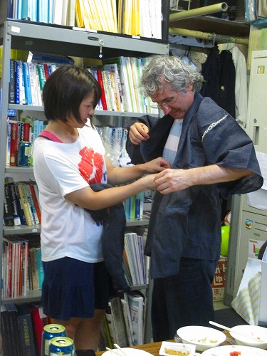 豆と小麦粉を使った主食作り、おにぎりみたいな感覚…。 ![]() フセインさんから各食べ物の説明を受けました。 ![]() 皆美味しくいただきました。 ![]() 皆からフセインさんに日本の甚平をプレゼントしました。。 |