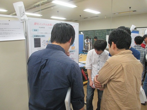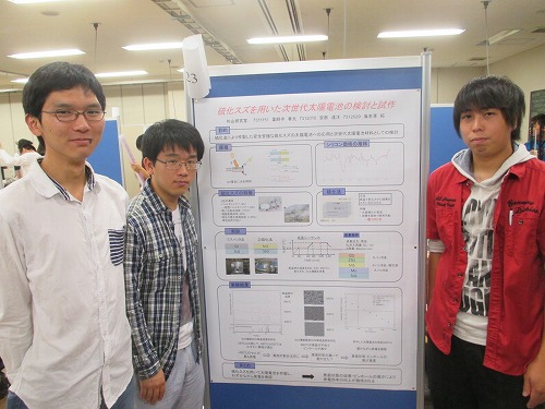 最初は緊張しながら、 ![]() 研究・調査内容を紹介します。 ![]() 今年は、NiO透明太陽電池と、 ![]() SnS硫化物太陽電池の研究を行いました。
