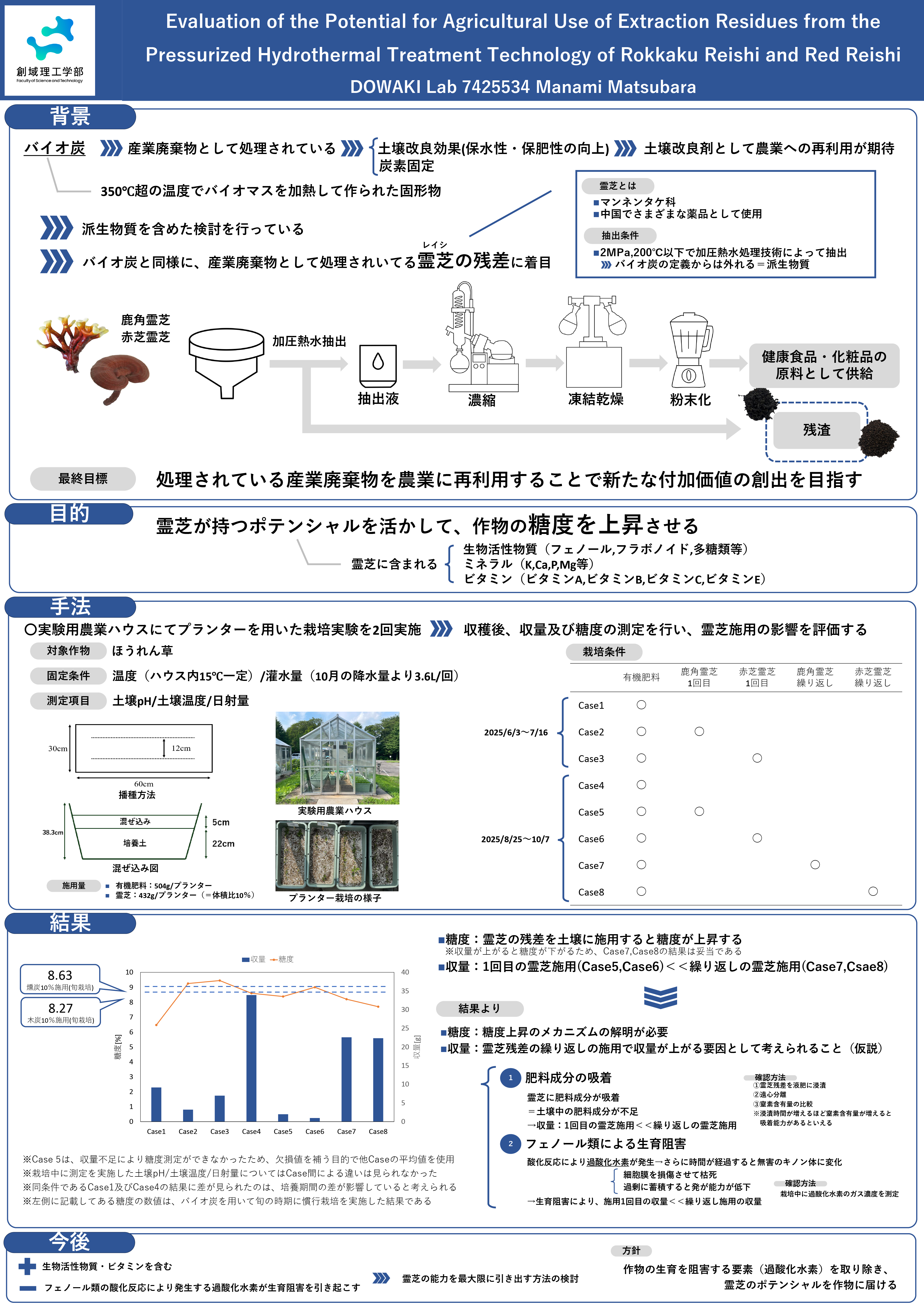 タイトル:Evaluation of the Potential for Agricultural Use of Extraction Residues from the Pressurized Hydrothermal Treatment Technology of Rokkaku Reishi and Red Reishi
